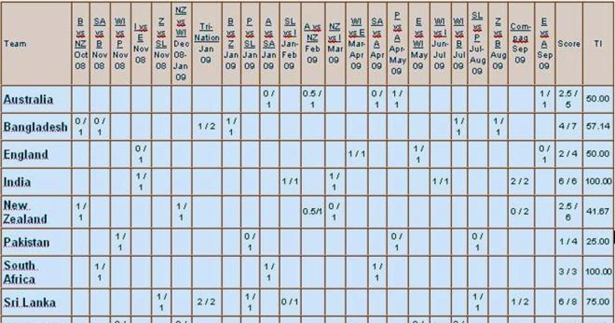 | TABLE B: ODI SCORECARD (as on September 18, 2009; used to compute WI) |