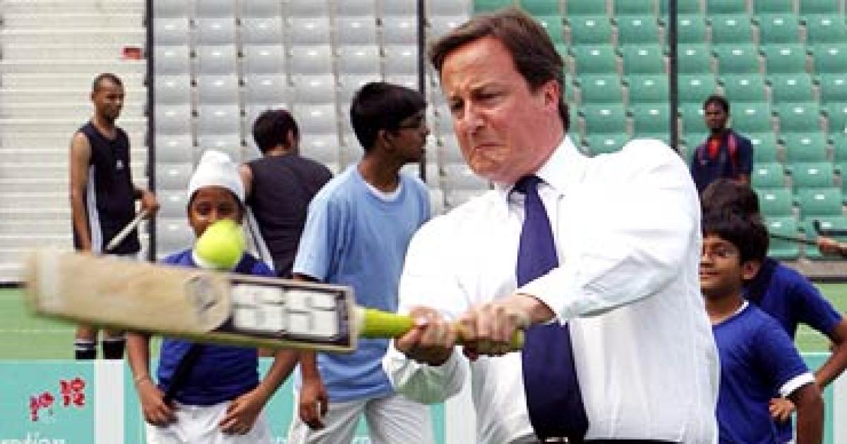 British Prime Minister David Cameron on Thursday showed his dexterity with the cricket bat as he played out a few deliveries bowled to him by the legendary Kapil Dev.