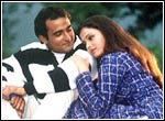 "Rishi Kapoor made one mistake here. He made the hero look a little odd. In India a good boy who loves his parents and who looks like he will look after them suddenly runs off to America for a job and money and tries to con a girl into marrying him for a green card. He then accuses her of being bad because she smokes and drinks. I mean, what is Rishi Kapoor trying to say here -- that America is the land of opportunity and that opportunity corrupts," says Nahata. "Rishi Kapoor was also confused whether he should concentrate on his hero being an opportunist with a heart of gold or to instil traditional values into us, to tell us that our country is the best... Still, the film isn't a total flop. It remained steady in most centres and lost only in places like Rajasthan and east Punjab. But that's enough to put the producer Rishi Kapoor in the red." Aishwarya's image didn't work wonders at the box office either. This is her third flop in Hindi. "She is very plastic in some scenes and wooden in others", laughs Komal. Even the rumours that Akshaye and Ash were having a love story of their own didn't impress people enough to go and see the film. Hum Aapke Dil Mein Rehte Hain is the only one to hit the bull's eye. It did very well in Bombay and Maharashtra and decently in other parts of the country too. The credit might go to the story, which isn't too traditional but not very modern either. This film does have a different storyline and Kajol is excellent in the film. This is her fourth hit in a row.