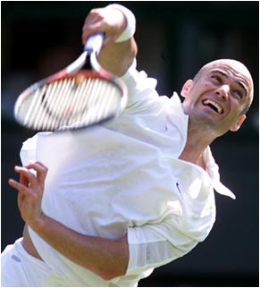 Andre Agassi on his way to victory over Peter Wessels of Holland. Agassi overcame the challenge thrown up by Wessels to triumph 7-6, 6-4, 6-4.