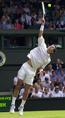 Tim Henman of Great Briatin serves against countryman Martin Lee in a men's second round match. The sixth seeded Henman had no mercy for his compatriot, cruising to a 6-2, 6-3, 6-4 victory on Centre Court.