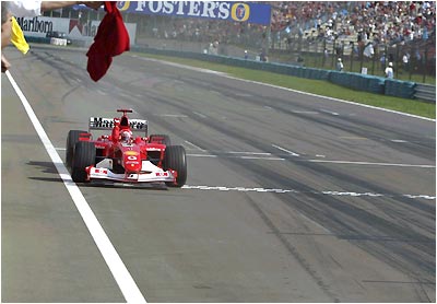 Barrichello celebrates as he crosses the finish to win the Hungarian Grand Prix