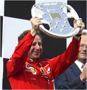 Jean Todt of Ferrari celebrates with the constructors trophy.
