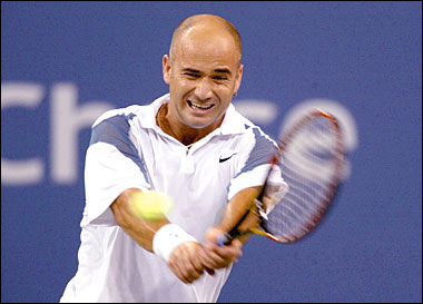 Former U S Open champion Andre Agassi returns a shot during his first round match against Robby Ginepri.