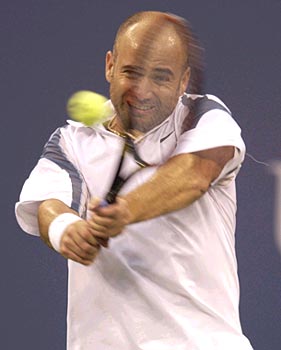 Andre Agassi completed a 66 minute demolition of fellow American Justin Gimelstob. He won 6-0, 6-1, 6-1.