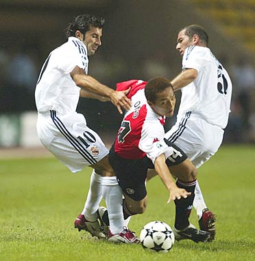 Luis Figo and Zinedine Zidane of Real Madrid tackle Shinji Ono of Feyenoord during the Real Madrid v Feyenoord UEFA Super Cup at the Stade Louis II in Monaco.