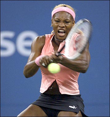Women's world No. 1 Serena Williams, wearing a more traditional pink top and black shorts in place of the eye-popping skin-tight, black lycra outfit that drew stares in her opening two matches, was full of confidence as she demolished Nathalie Dechy of France 6-1, 6-1.