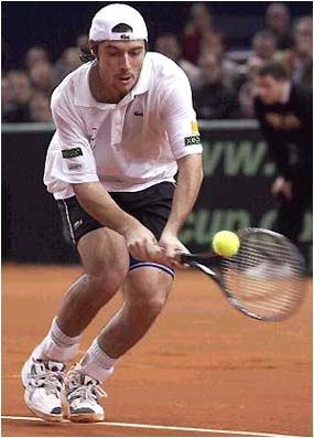 In Sunday's first reverse singles, Safin battered Sebastien Grosjean (in pic) into a 6-3, 6-2, 7-6 submission to level the tie at 2-2.