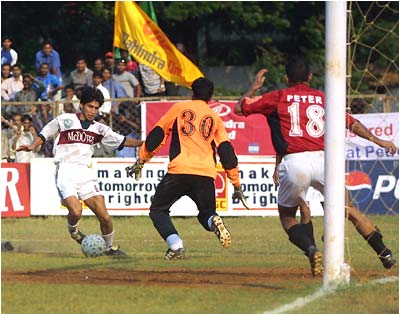 Mahindra United goalkeeper Feroz Sheriff rushes out to thwart Mohun Bagan's Renedy Singh as defender Peter Siddiqui waits on the goalline.