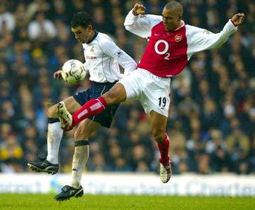 Gilberto Silva of Arsenal tries to tackle Gustavo Poyet of Tottenham Hotspur. The Arsenal midfield was beginning to find it's feet too and slowly but surely the Spurs were having to defend from their half.