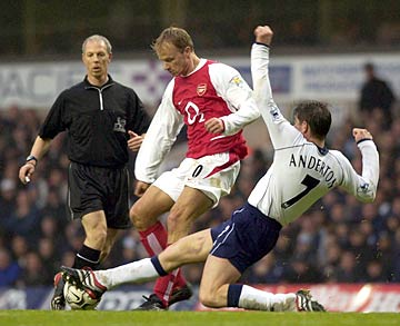 Dennis Bergkamp is tackled by Darren Anderton of the Spurs. Bergkamp was disappointing and was substituted by Sylvian Wiltord in the second half.