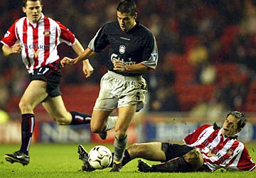 Paul Thirlwell of Sunderland tackles Milan Baros of Liverpool.