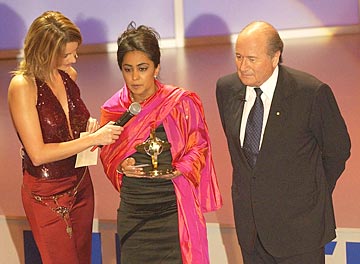 British actress Parminder Nagra receives the FIFA Presidential Award for her role in Gurinder Chadha's film, Bend it like Beckham. On her left is FIFA President Sepp Blatter.