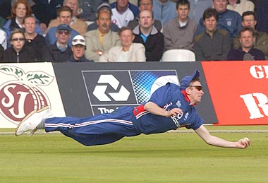 James Kirtley of England take a superb catch to dismiss Sourav Ganguly during the match between England and India in the NatWest One Day Series at Lord's in London, England.