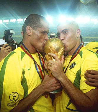 Rivaldo and Ronaldo kiss the World Cup after the Brazil beat Germany to win their fifth title.
