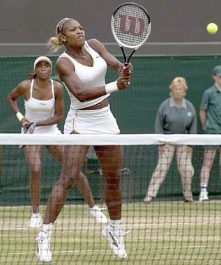 Venus and Serena Williams in action during their doubles match against the Slovenian pairing Tina Krizan and Katarina Srebotnik. The sisters won 6-2, 6-0.