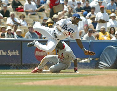 Adrian Beltre #29 of the Los Angeles Dodgers reaches unsuccessfully for the ball as Edgar Renteria #3 of the St. Louis Cardinals is safe at third on a Dodger error allowing two Cardinals to score in the seventh inning at Dodger Stadium in Los Angeles, California.