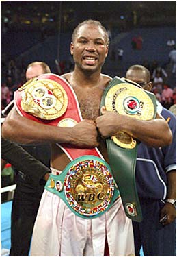 Lewis is all smiles as he proudly displays his championship belts after the knock-out victory.