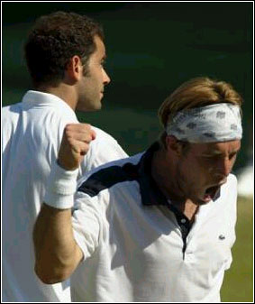 George Bastl of Switzerland celebrates after his victory over seven-time champion Pete Sampras of the US.